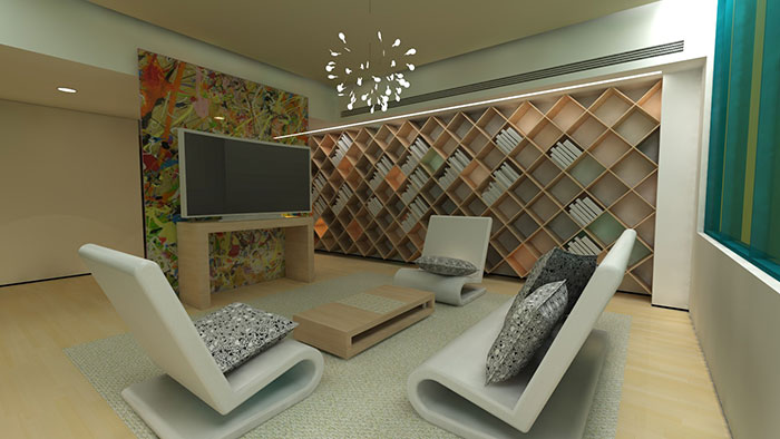 the second floor is the family room with 2 slanted bookshelves on either ends. (the LED tv is a modern day addition, obviously) |