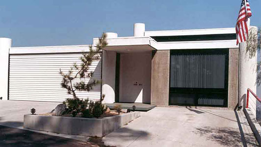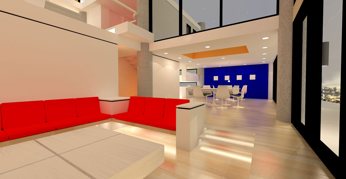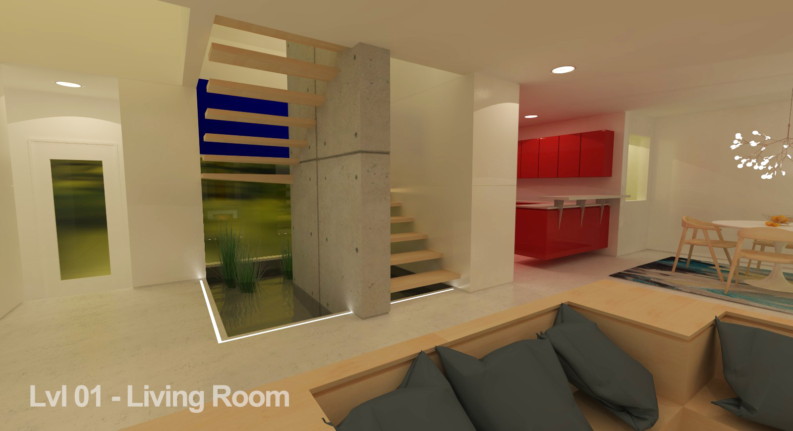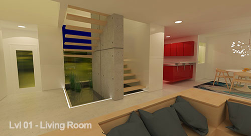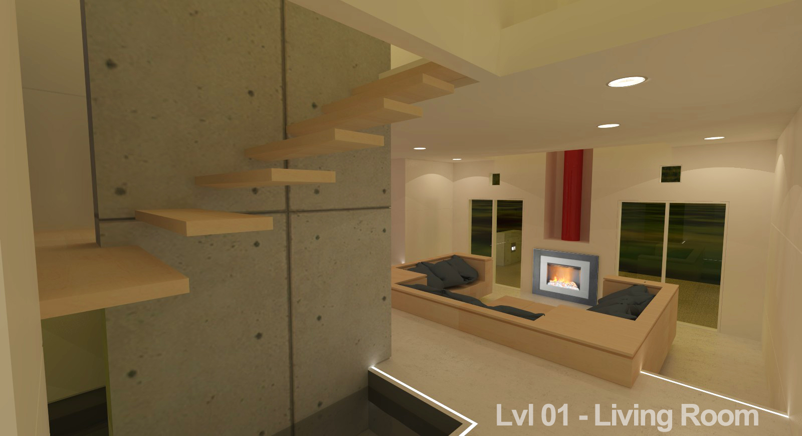 upon entry you see the stairs with cantilevered treads to the left and the sunken living room with built-in seating. |