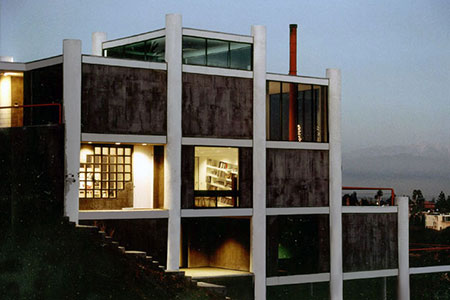 a chalet in the san bernardino mountains of wrightwood, a ski resort for southern californians. the home's geometry was inspired by the rubik's cube. this is in a snow area so pitched roofs are more desirable.
