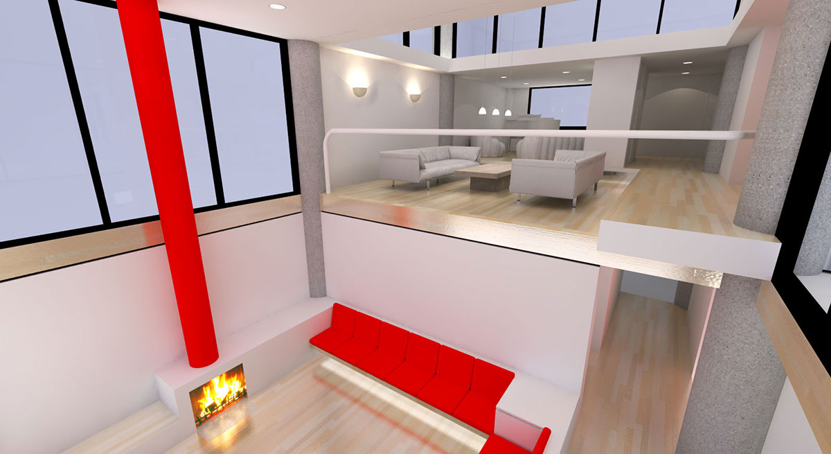 the second floor is the family room with 2 slanted bookshelves on either ends. (the LED tv is a modern day addition, obviously) |